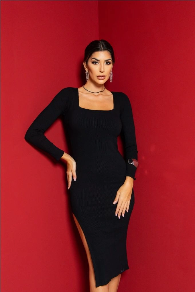 Além disso, o decote quadrado valoriza a silhueta e cria aparência sofisticada. A cor preta amplia possibilidades de combinação. Esse modelo demonstra como as peças em tricot podem ser elegantes e contemporâneas.