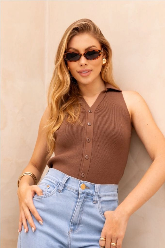 Além disso, o tom marrom combina facilmente com diferentes looks. Essa blusa pode aparecer com jeans, saias ou alfaiataria. Entre as peças em tricot, as regatas oferecem leveza e estilo para o dia a dia.