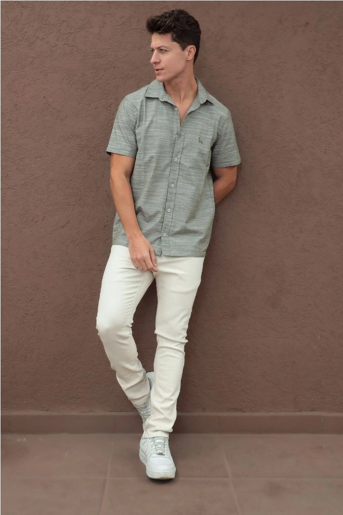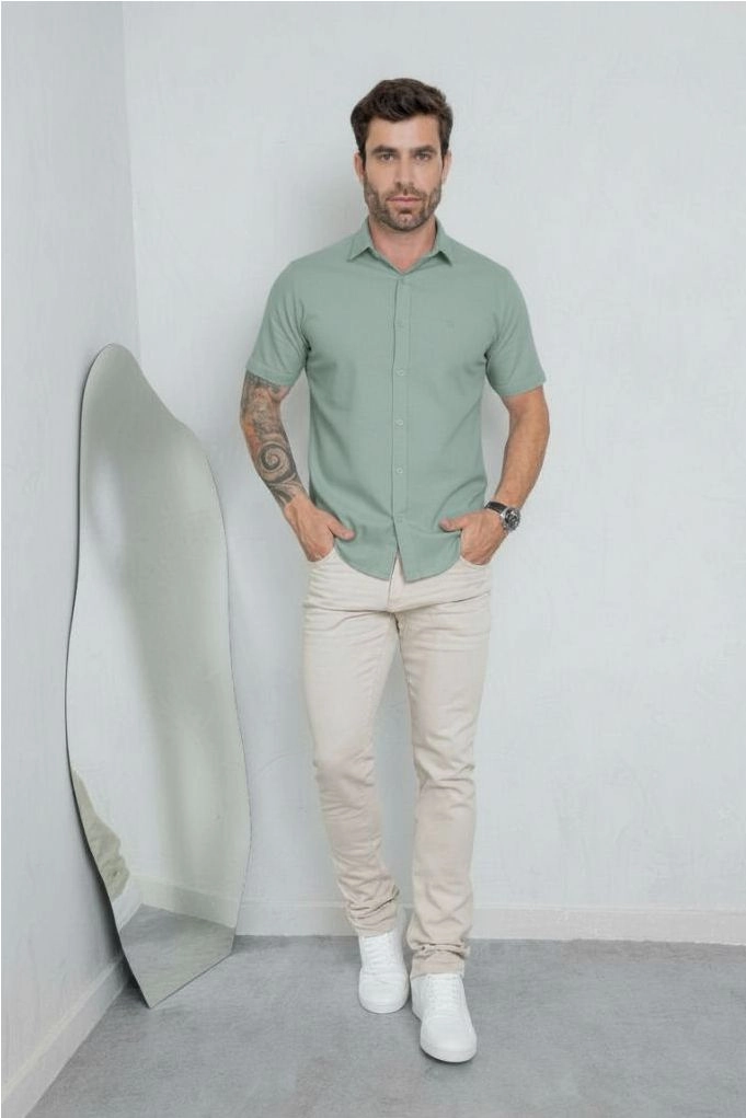 Essa união cria um visual leve, ideal para passeios, encontros informais e momentos de lazer. Já para quem busca um estilo mais urbano, a camisa masculina pode acompanhar calças chino ou jeans claro, equilibrando elegância e descontração.