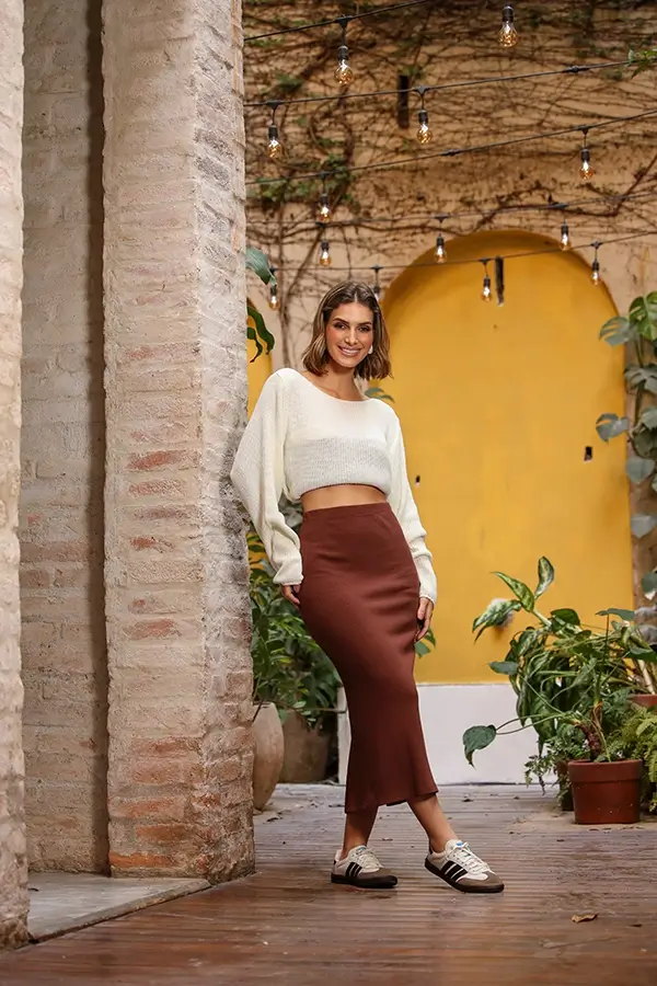 A Saia Midi Mépsila é o tipo de peça que combina com tudo. A modelagem midi traz sofisticação imediata ao visual, enquanto o tecido canelado valoriza a silhueta de forma elegante.