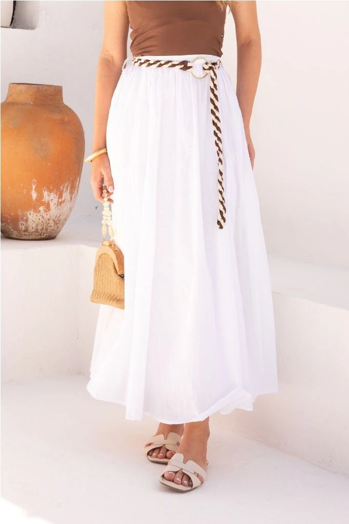 O branco, símbolo da paz e da renovação, é a cor mais buscada para a virada do ano, o que torna essa saia indispensável. Use com blusas em tecidos leves, sandálias de salto médio ou rasteiras metalizadas. Para um look boho, adicione brincos grandes e pulseiras com pedrarias claras.